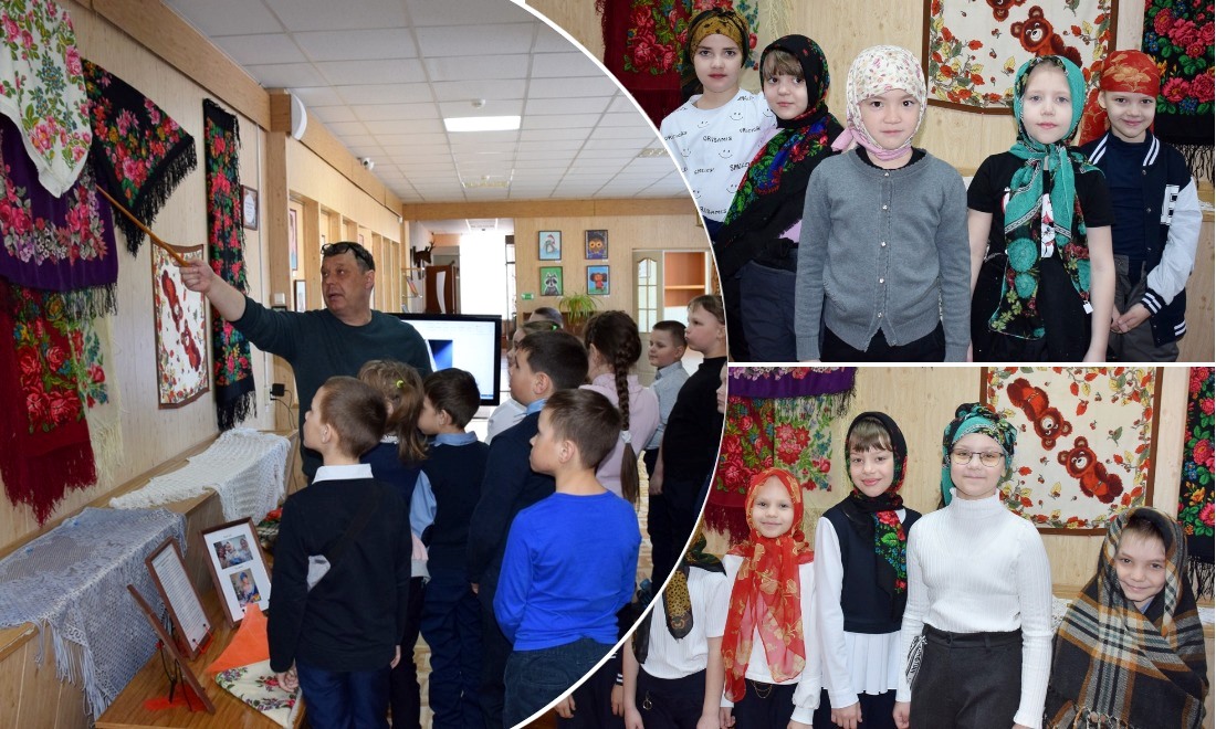 Учащиеся узнали об истории платка, его производстве в России и различных видах. Заведующий передвижной выставкой Алексей Савельев рассказал, что платок появился в конце X века, а его предшественником был убрус — головное полотенце, которое носили замужние женщины.